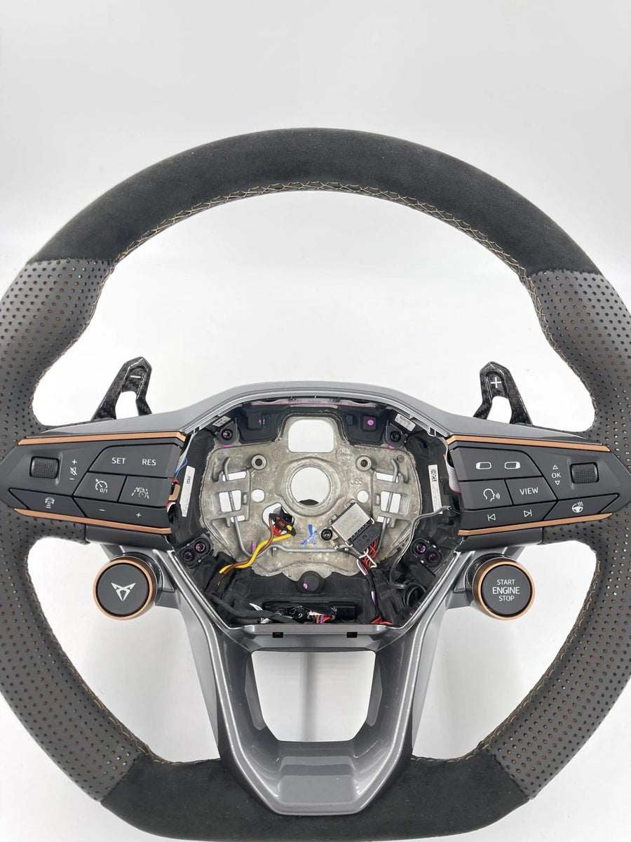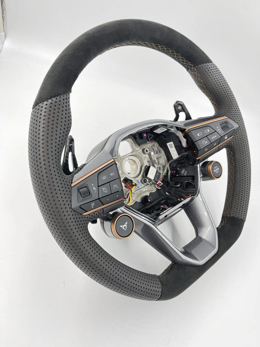 Douze ans de volants sur mesure, avec soufflets de levier de vitesse, pommeaux et accoudoirs assortis. Nous utilisons des matériaux de première qualité comme l'Alcantara d'origine, le carbone, le daim et le cuir Nappa.